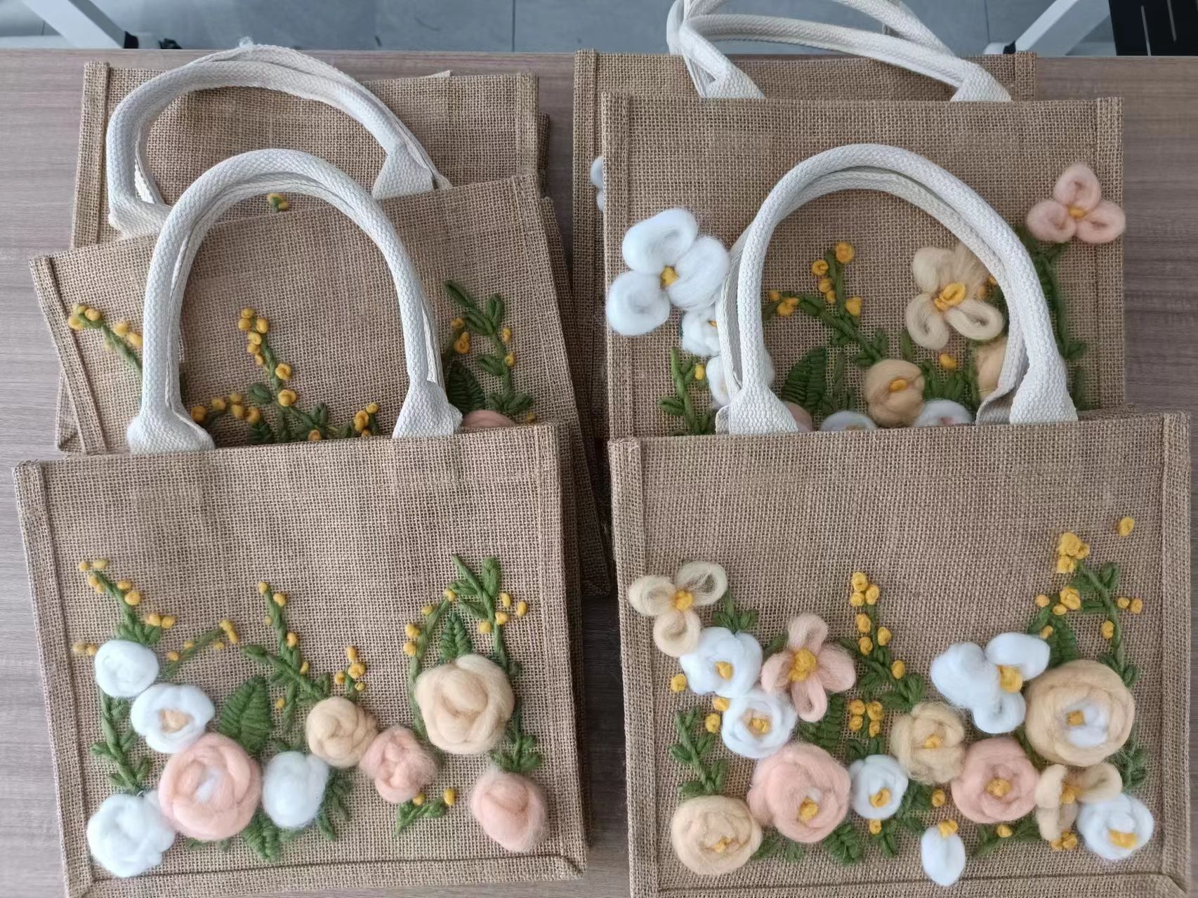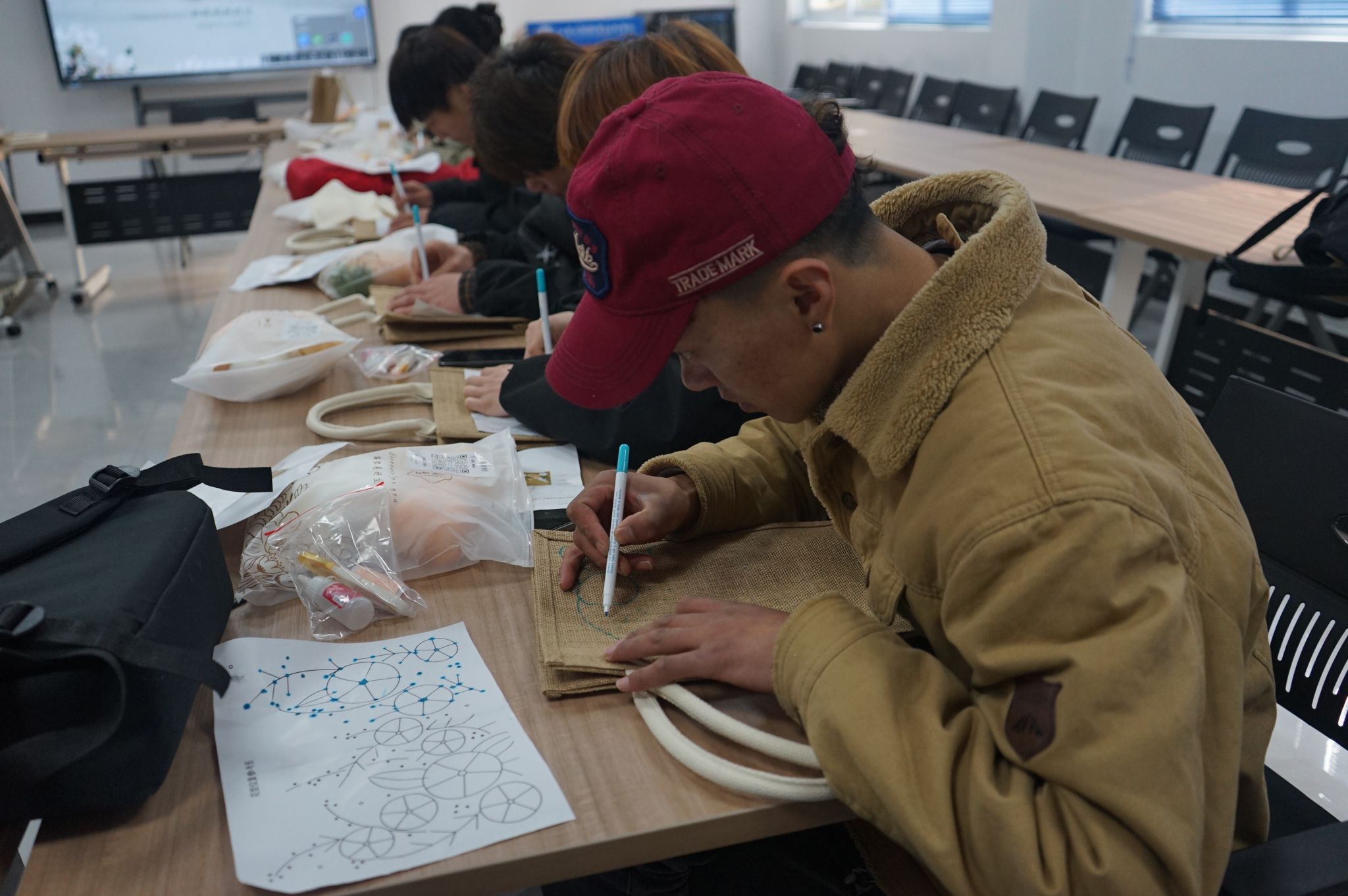 活动开始,指导老师阮洪妮讲解了拓印稿纸、绣线知识。同学们开始绣制属于自己的麻布包,繁花盛开,温馨甜美的白色粉色花瓣点缀,花朵用毛线盘绕,如春般和煦,亲手绣制出属于自己的美好印记。