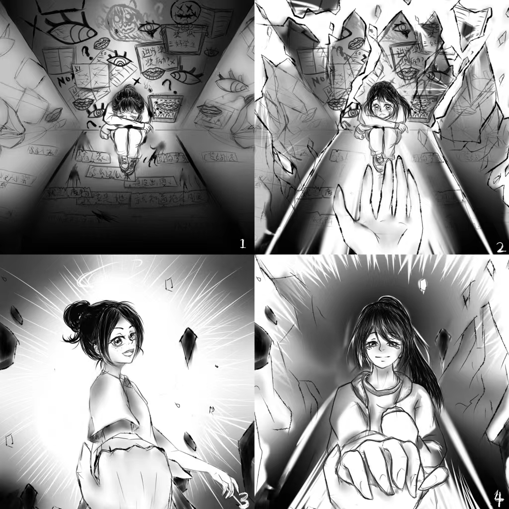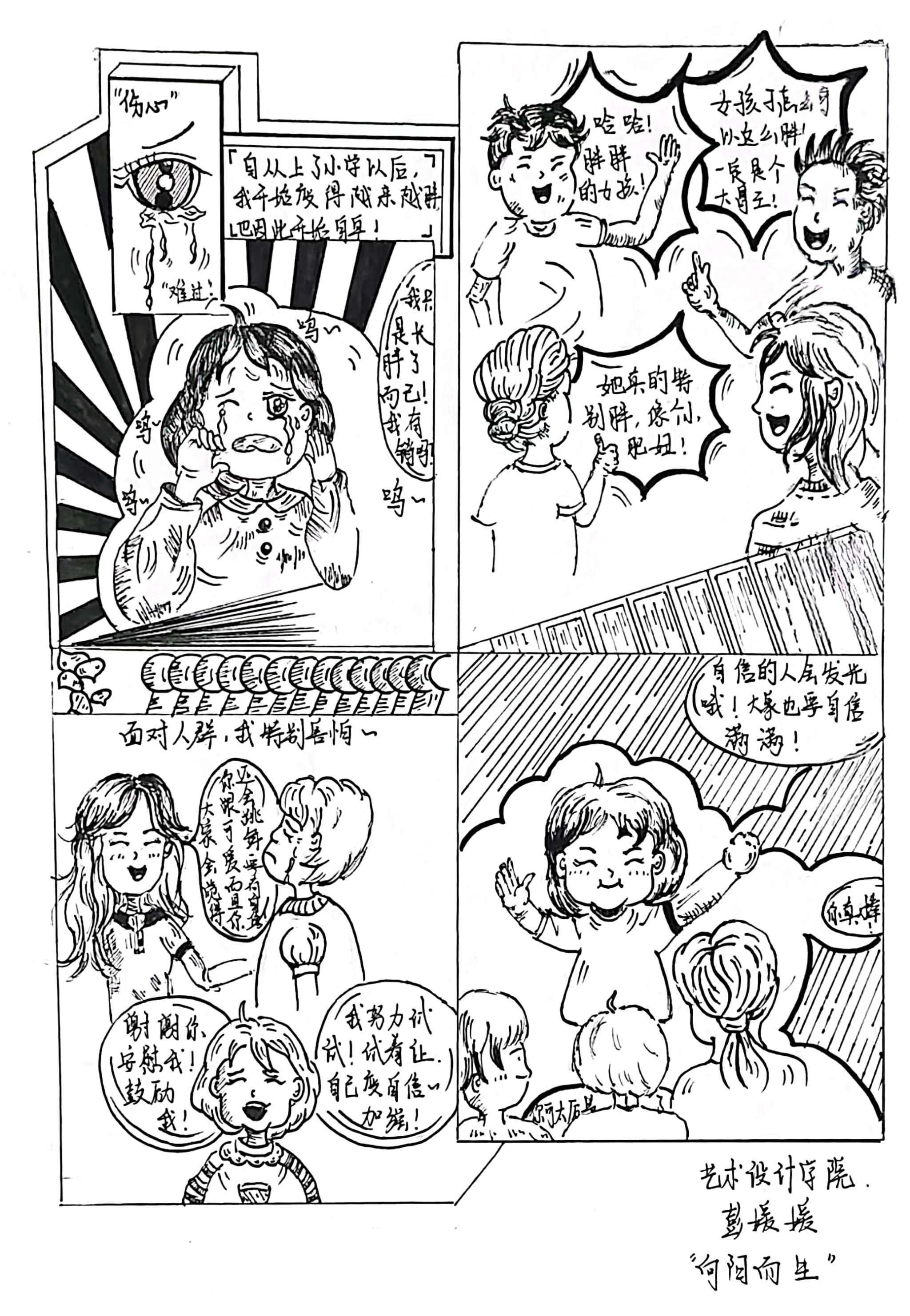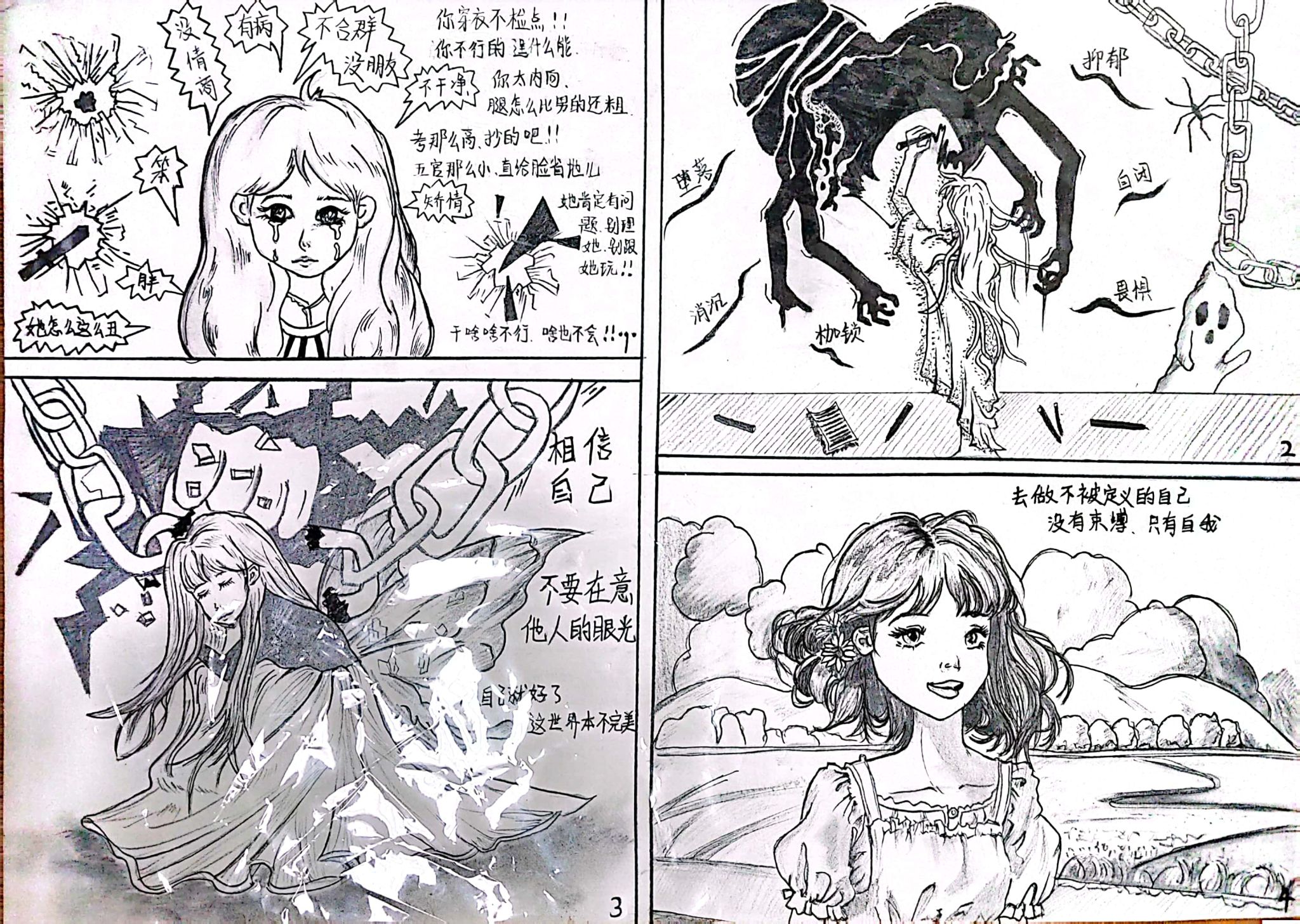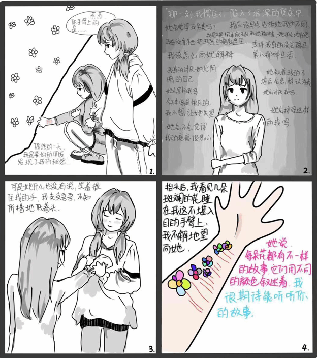 作品介绍:本幅漫画为本人身边真实故事,主角由于外界因素导致心理出现问题,选择对自己进行身体上的伤害,当身边的人注意到她的问题后伸出援手。其中漫画中的“花”代表身边人给予她的关心和帮助,用爱来遮挡“受伤的胳膊”,主要表达当你感觉到有压力和心理困扰的时候,要及时与身边交心的人倾诉,他们会尽心尽力的帮助你。