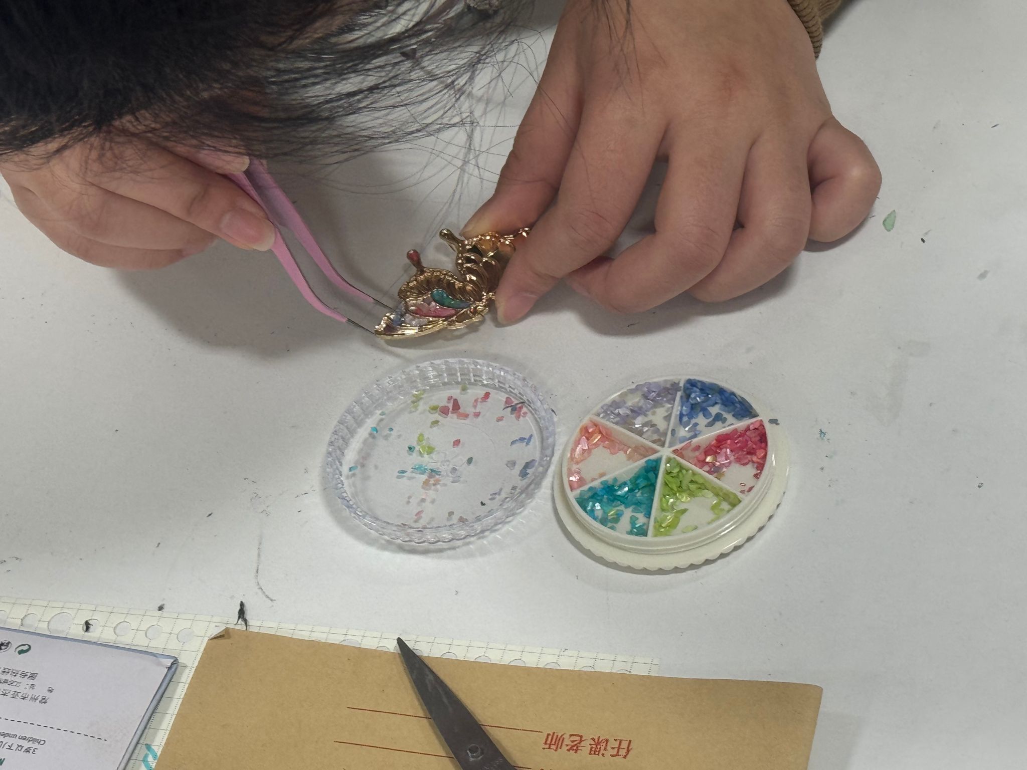 活动开场,织绣阁刺绣社团社长苗伊菲深入浅出地为同学们介绍了螺钿工艺的千年历史。从商周时期的古朴雏形,到唐宋时期的蓬勃发展,再到明清时期的登峰造极,螺钿工艺在历史长河中的每一次蜕变都让同学们惊叹不已。在制作环节,现场气氛热烈而温馨。将螺片镶嵌到饰品坯体上时,面对切割贝壳易碎、拼接图案难等问题,同学们不气馁,相互交流、分享经验,共同探讨螺钿工艺的奥秘。随着一件件精美的螺钿作品应运而生,不仅展示了同学们的动手能力和审美情趣,更体现了中华传统文化的魅力。