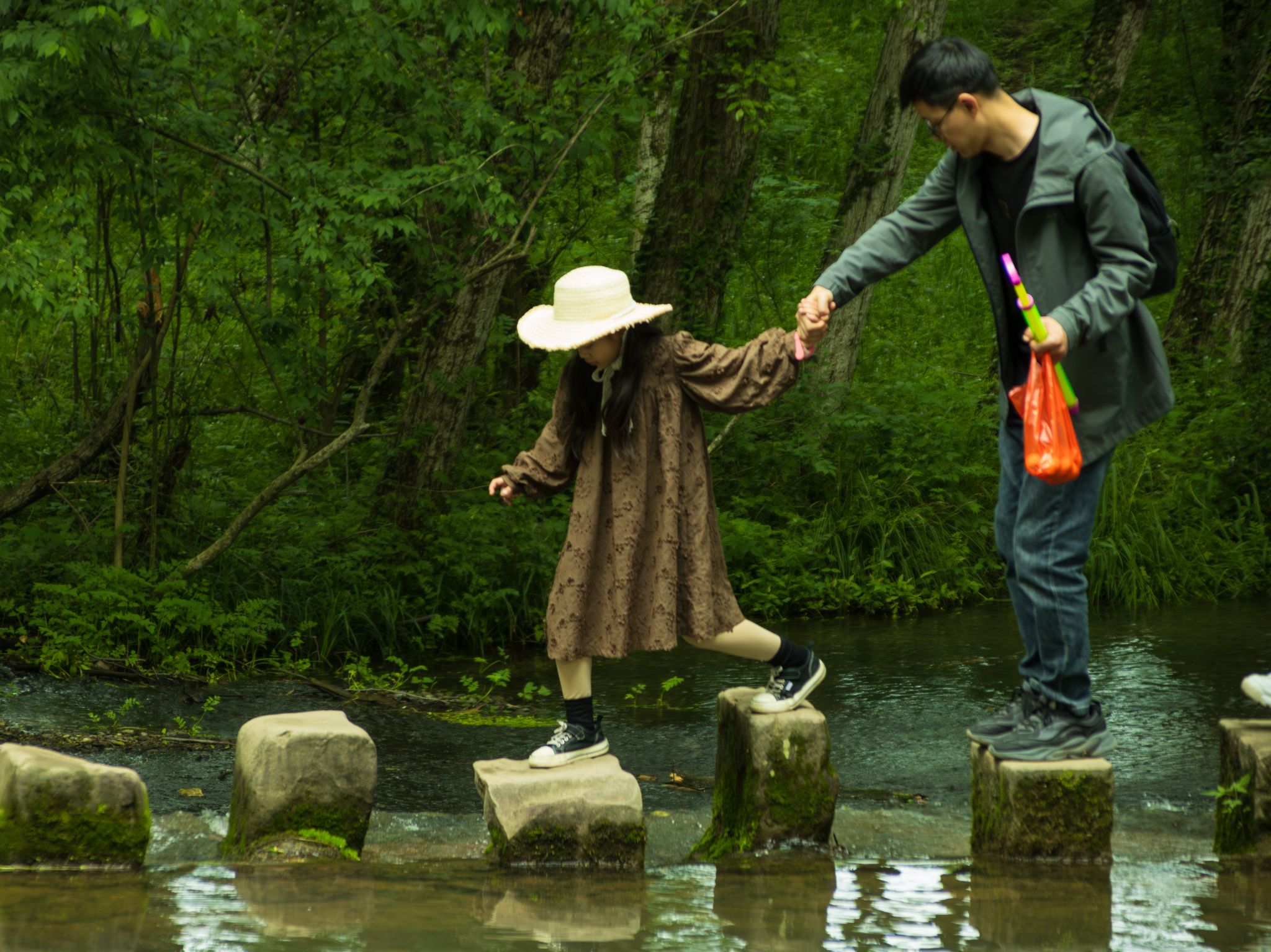 作品介绍: 画面定格于绿意盎然的林间,溪水潺潺,父女俩正携手跨越水中石墩。父亲的“大手”稳稳牵引,传递着守护与力量;女儿的“小手”紧紧相握,满是依赖与信任。这一双“大手小手”,不仅是跨越自然障碍的支撑,更象征着成长路上亲情的温暖陪伴——在葱郁自然的见证下,父亲以爱为引,带领孩子迈出探索世界的每一步,让亲情在细微相处中绽放动人光芒。见此场景,我急忙拿出相机拍下这暖心一刻。