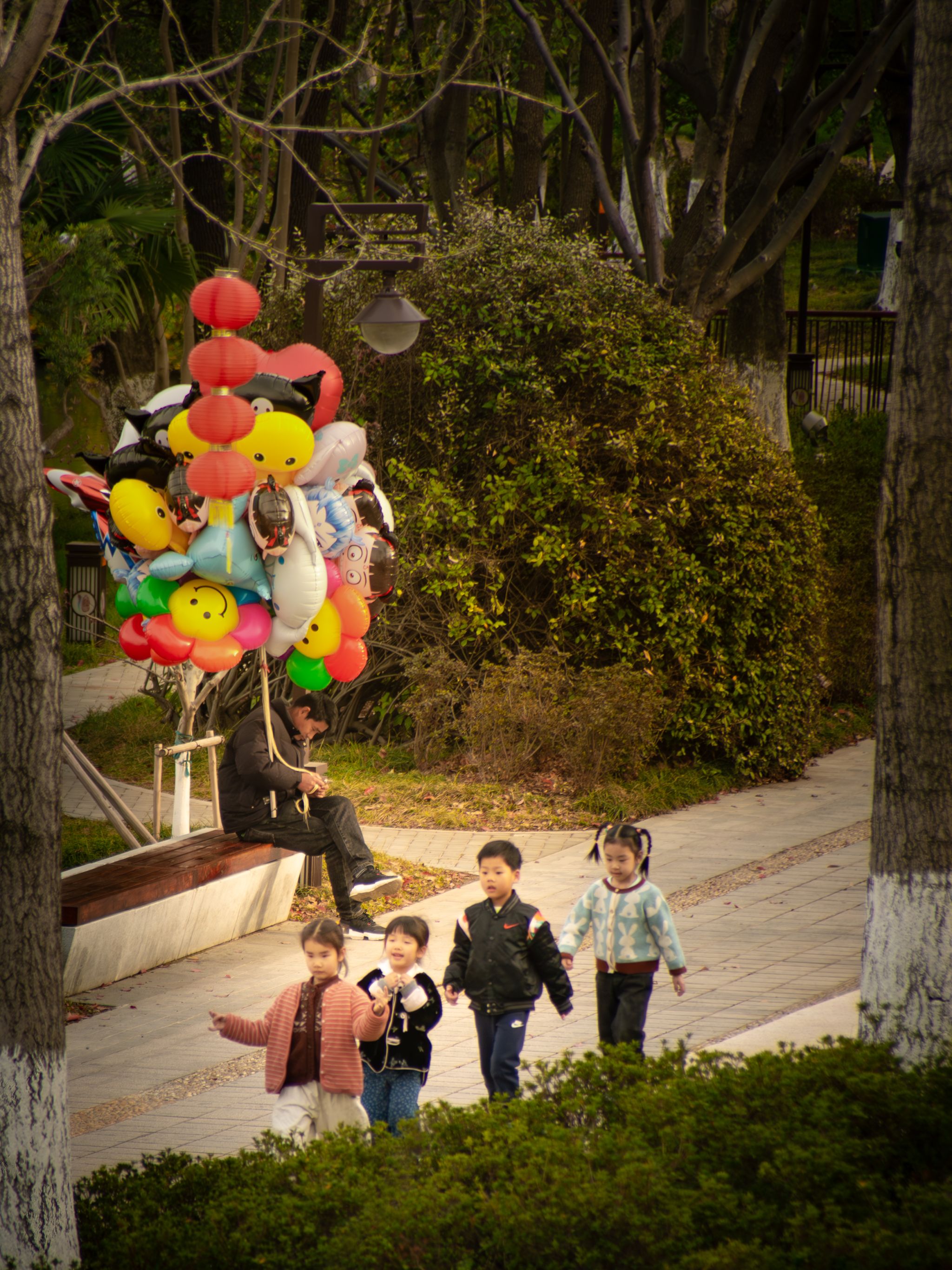 作品介绍:作品捕捉了公园小路上孩子们欢快前行的瞬间,他们脸上洋溢着纯真与喜悦。一旁长椅上,坐着售卖色彩缤纷、造型多样气球的摊主,为画面增添了活泼氛围。背景绿树环绕,光影交错,整体勾勒出一幅充满生机与童趣的日常图景,传递出平凡生活里的温馨与美好,唤起人们对纯真童年时光的美好回忆 。