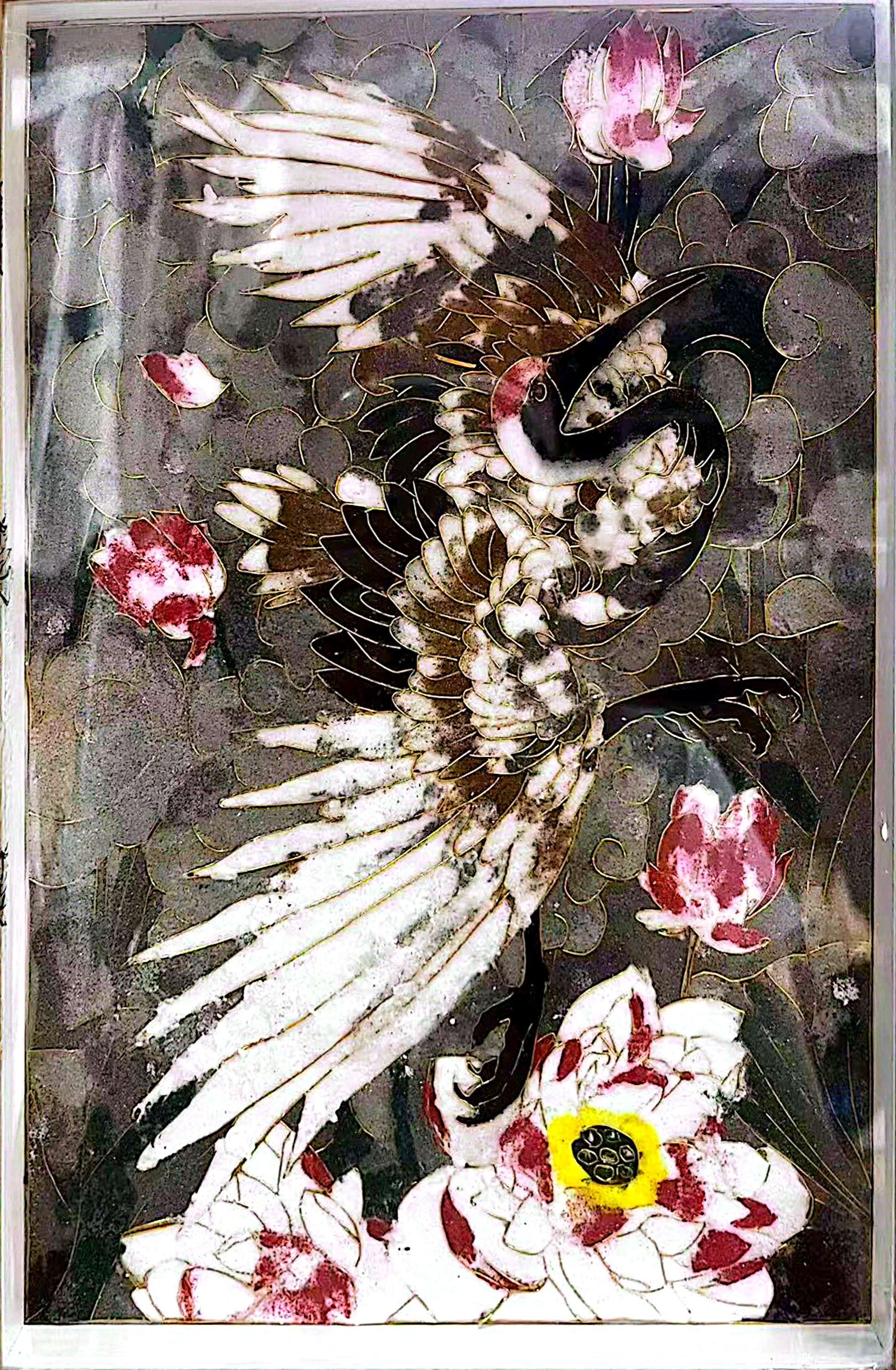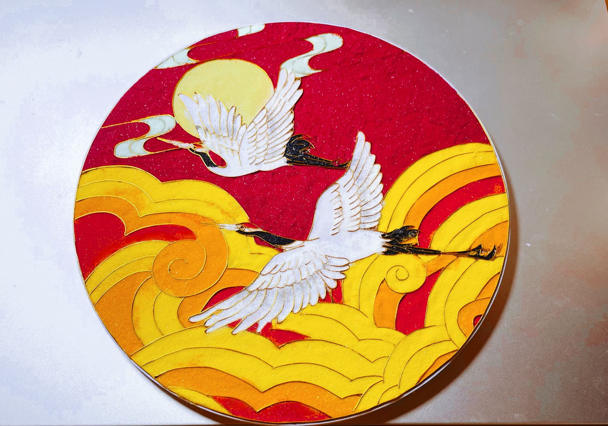 这幅以"非遗中的心灵疗愈"为主题的掐丝珐琅作品,以"坚韧·传承·希望"为核心,运用传统景泰蓝工艺。金丝勾勒的仙鹤象征文化坚守;渐变珐琅彩料的祥云隐喻技艺沉淀;朱砂点染的旭日喻示传统工艺的新生命力。