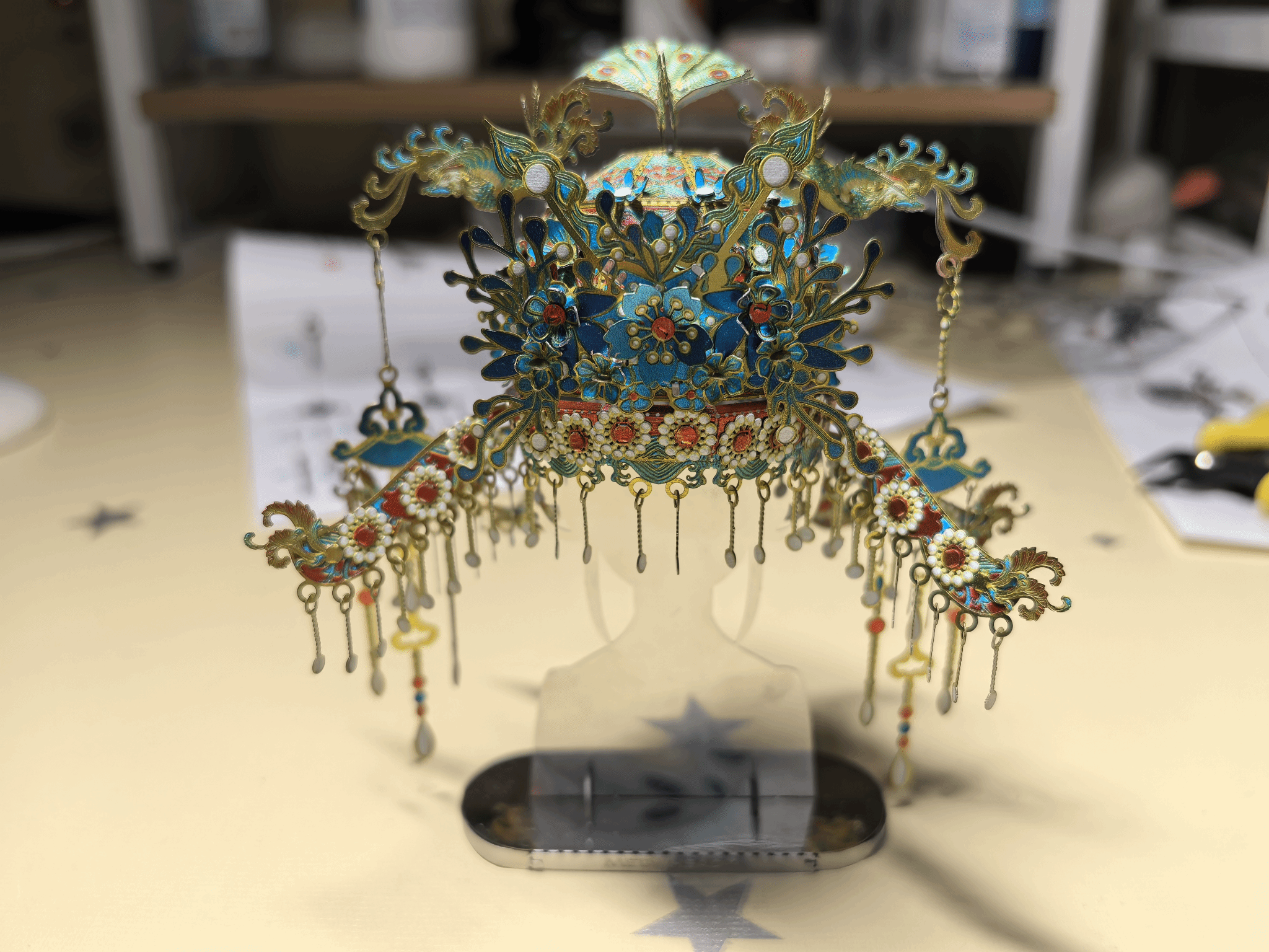 点翠凤冠具有象征意义。凤是中国传统文化中吉祥、高贵的象征,凤冠代表着身份和地位。佩戴点翠凤冠,能让女性获得一种心理上的满足感和自豪感,体现出她们对自身社会角色的认同和追求。从审美心理来看,点翠凤冠工艺精湛,翠羽的鲜艳色彩和独特光泽,以及复杂精美的造型,能给人带来视觉上的愉悦和美的享受。这种审美体验可以激发人们内心对美的追求和向往,满足人们的审美需求。