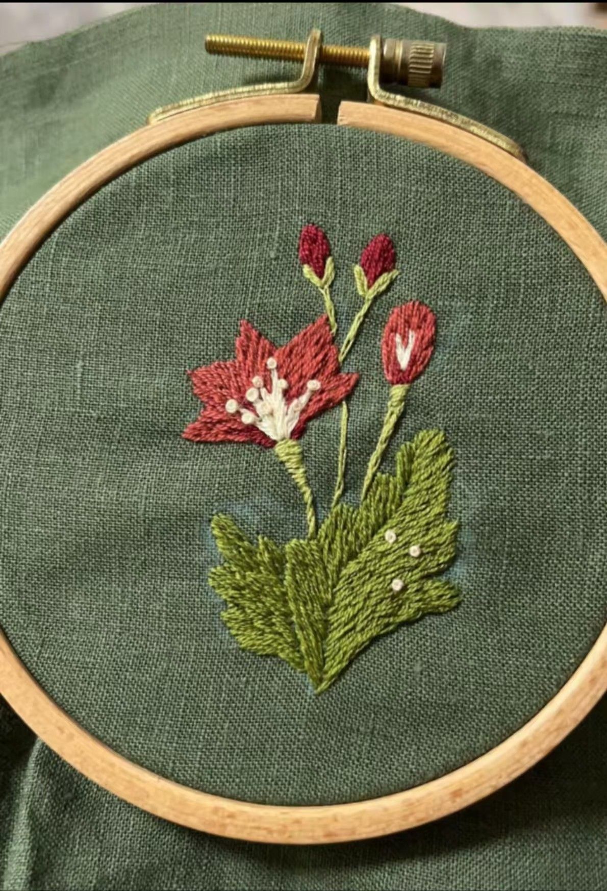 刺绣,作为中国传统技艺的瑰宝,承载着千年的匠心与智慧。当我拿起绣针,丝线在指尖穿梭,每一针都像是与古人对话。红梅,在中国传统文化中是坚韧不屈的象征。它于凛冽寒冬独自绽放,不畏惧冰雪肆虐,那一抹鲜艳的红,是对困境的勇敢抗争。