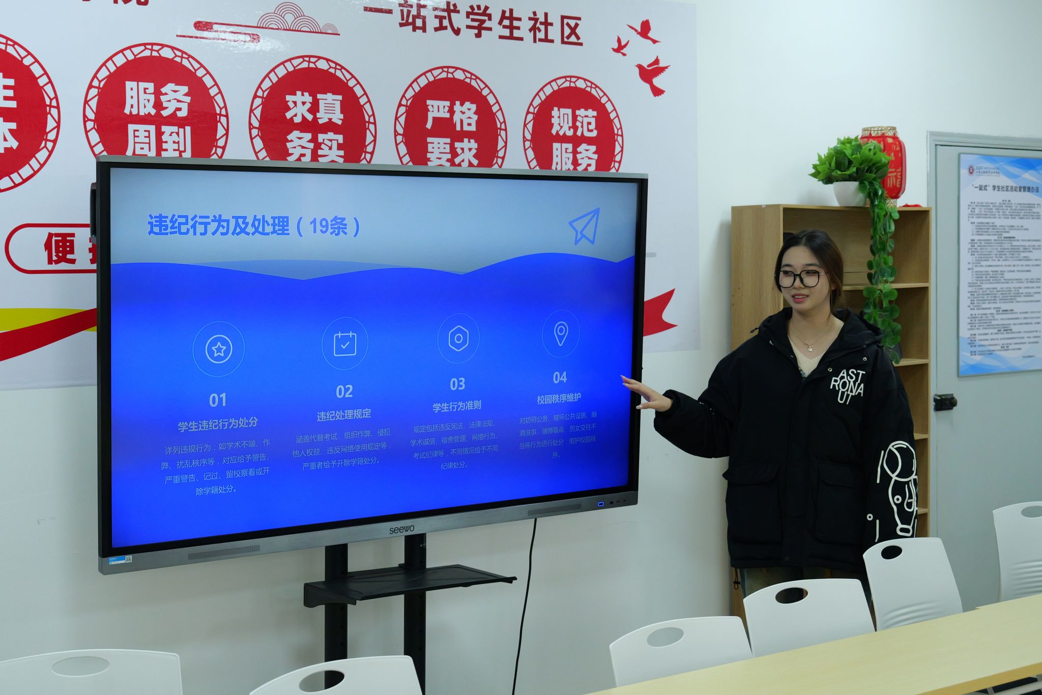 窦琪首先列举了近期学院内发生的几起违纪案例,并深入剖析了这些违纪行为产生的原因及造成的负面影响。她强调,遵守学院规章制度是每一位学生的基本义务,也是维护学院正常秩序和良好风气的必要保障。随后,窦琪详细解读了学院关于课堂纪律、宿舍管理、考试规范等方面的规章制度,并结合具体案例,对制度的细节内容进行了细致的讲解。她鼓励同学们认真学习学校规章制度,将制度内化于心、外化于行。活动现场,同学们认真聆听,积极参与互动,就一些具体问题进行了深入交流,现场气氛热烈。