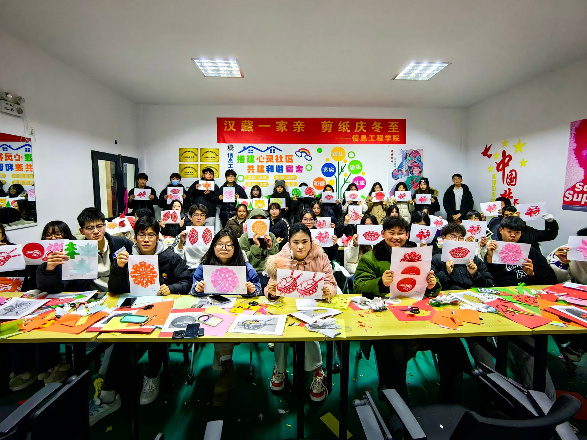 为深化“一站式”学生社区建设,挖掘中华传统节日文化内涵,展示传统“剪纸”文化魅力, 2023年12月22日下午,信息工程学院在海门阜生社区1-2号楼“红色家园”活动室开展“汉藏一家亲,剪纸庆冬至”主题活动。本次活动由“绿意育人”园艺社团和红石榴辅导员工作室联合举办,社团指导老师韩政,部分社团成员和民族生参加。
