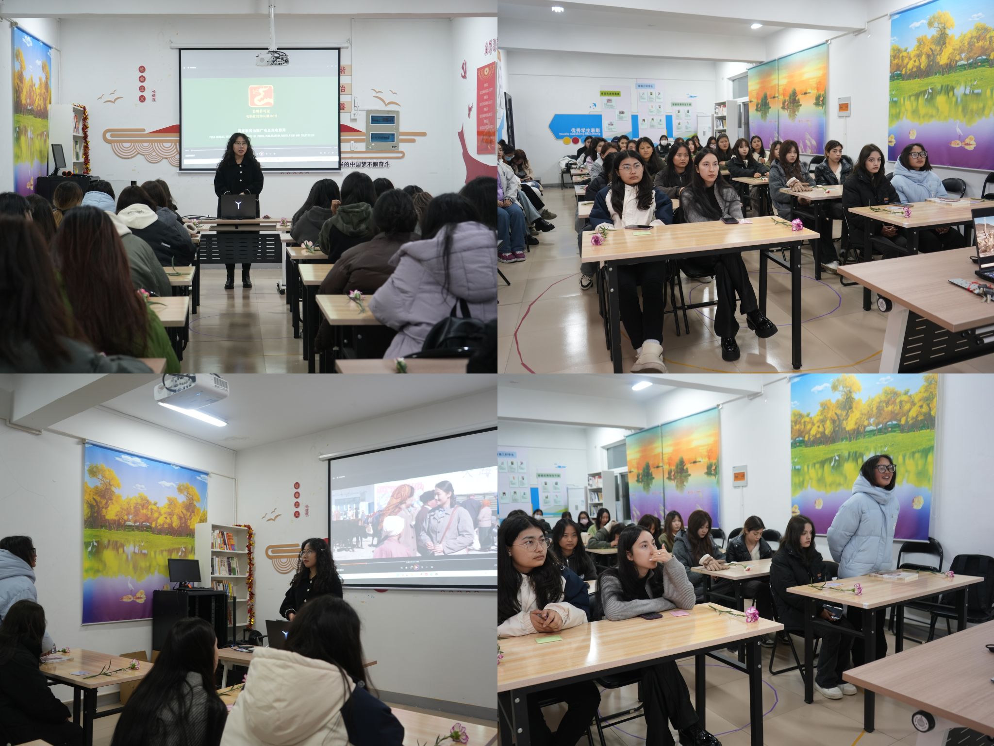 梅花餐厅一楼活动现场设置了少数民族女性知识科普问答、套圈、手写祝福信笺等环节,并准备了精美礼品。参与人数众多,现场氛围热烈,趣味十足,过往的女生纷纷驻足,写下美好祝福,并合影留念。晚上,红色家园活动室内,在艺术设计学院少数民族学生辅导员许照绮的带领下,来自经济管理学院、纺织服装学院、艺术设计学院的30名少数民族女生代表,一起观看了以2009年感动中国十大人物的优秀维吾尔族女性阿尼帕·阿力马洪的故事为原型的影片《真爱》,并举行了观影交流活动。阿尼帕在几十年的时间里抚养了6个民族的19个孩子,温暖真情,她传递民族大爱。同学们表示要向这位伟大的女性学习,向这位优秀的少数民族女性党员学习,民族团结一家亲,同心共筑中国梦!