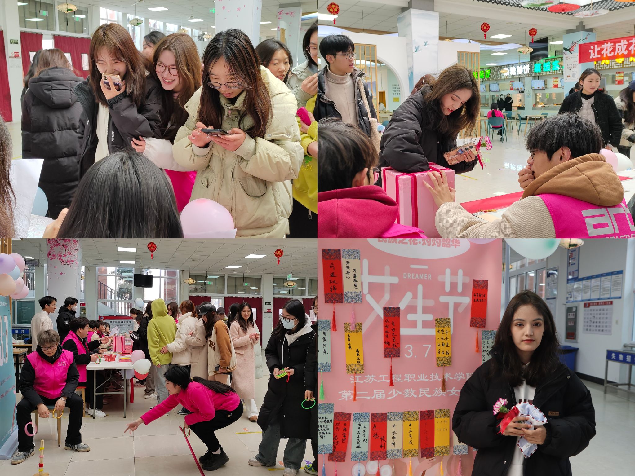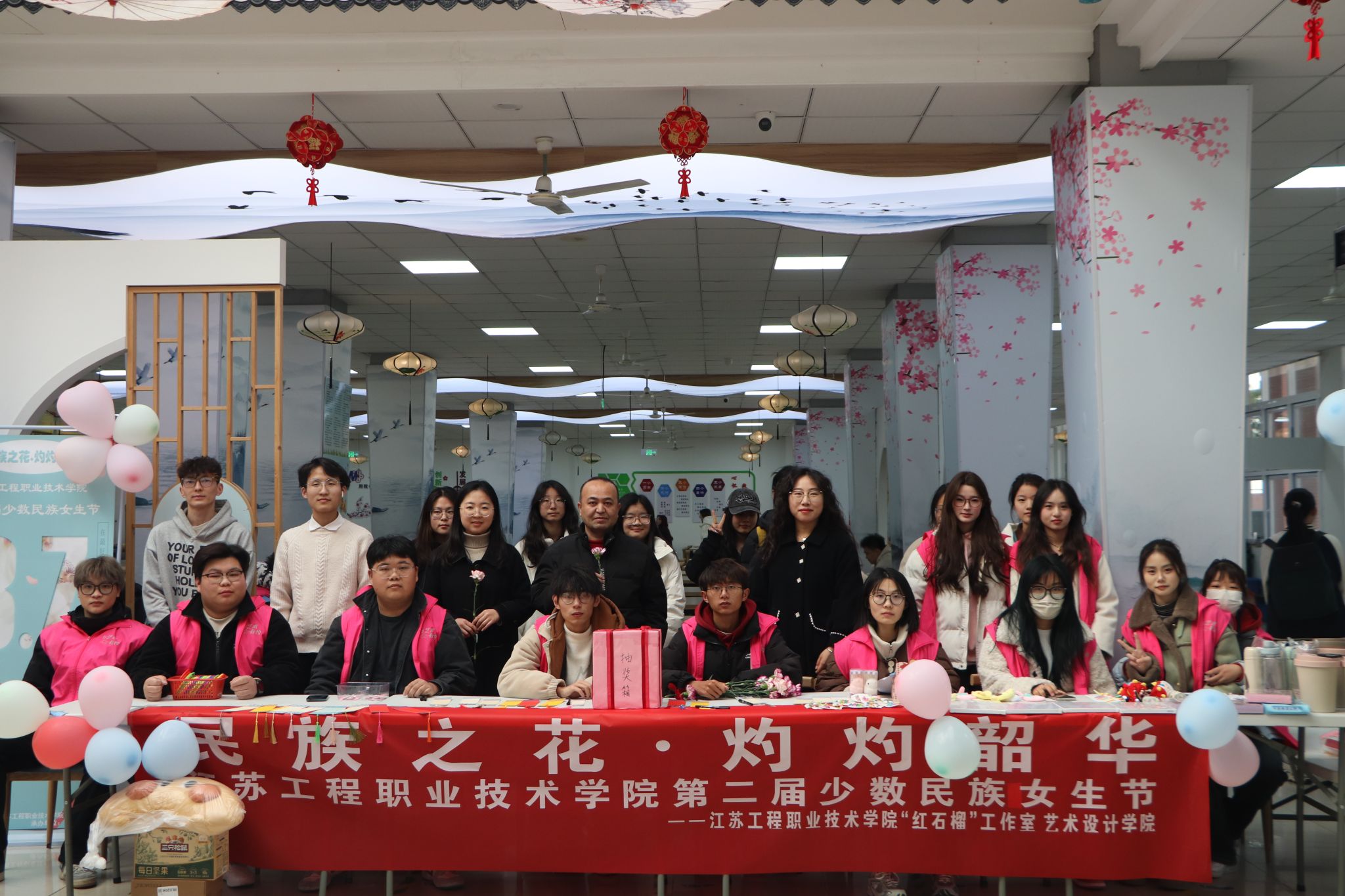 春拂三月繁似锦,灼灼韶华向阳生。3月7日下午,由“红石榴”辅导员工作室主办,艺术设计学院承办的“民族之花,灼灼韶华”——江苏工程职业技术学院第二届少数民族女生节活动,于崇川校区梅花餐厅一楼与学生社区活动中心红色家园活动室分别开展。校党委委员、副校长丛彬彬、信息工程学院党总支副书记高飞与团总支书记秦亚杰、新疆内派教师艾比不拉·塞买提与郭宏、艺术设计学院辅导员许照绮亲临梅花餐厅一楼活动现场。
