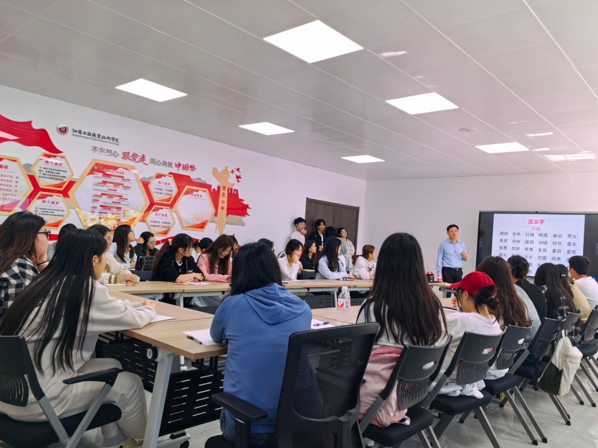 陶建锋从楹联的定义、楹联创作的注意事项等方面就诗联知识普及和创作对师生进行了细致授课,风趣幽默的谈吐、饱含深情的讲解,深受师生喜爱。活动现场,学生们在主讲老师的指导下,以小组讨论的形式,尝试构思创作关于“中华人民共和国成立75周年”主题对联。不多会,一首首饱含浓浓爱国情怀的诗词就创作而成,陶建锋逐一做了点评,并提出了修改意见。活动最后,校书法协会的同学书写了几首对仗工整、平仄押韵、立意深刻的诗词,一幅幅翰墨书韵的楹联就跃然于纸上。