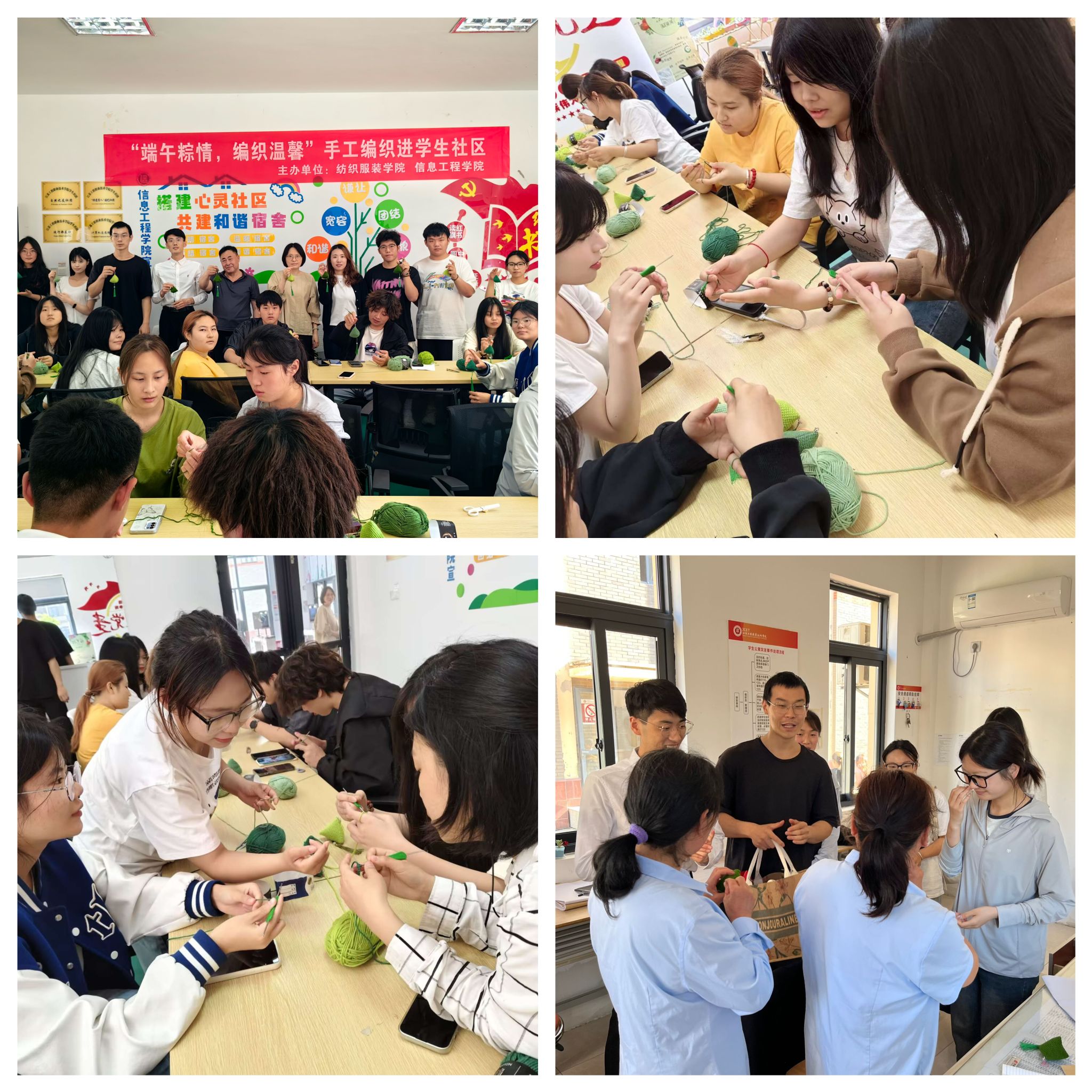 6月6日下午,纺织服装学院联合信息工程学院于海门校区学生社区多功能活动室开展了“端午粽情,编织温馨”手工编织进学生社区活动。校安保处领导段宏伟、纺织服装学院辅导员孟诗凯、信息工程学院辅导员韩政、陈贵屏,秦亚杰及海门校区相关学院的学生参加了本次活动。本次活动由纺织服装学院主办,手工文创社承办。
