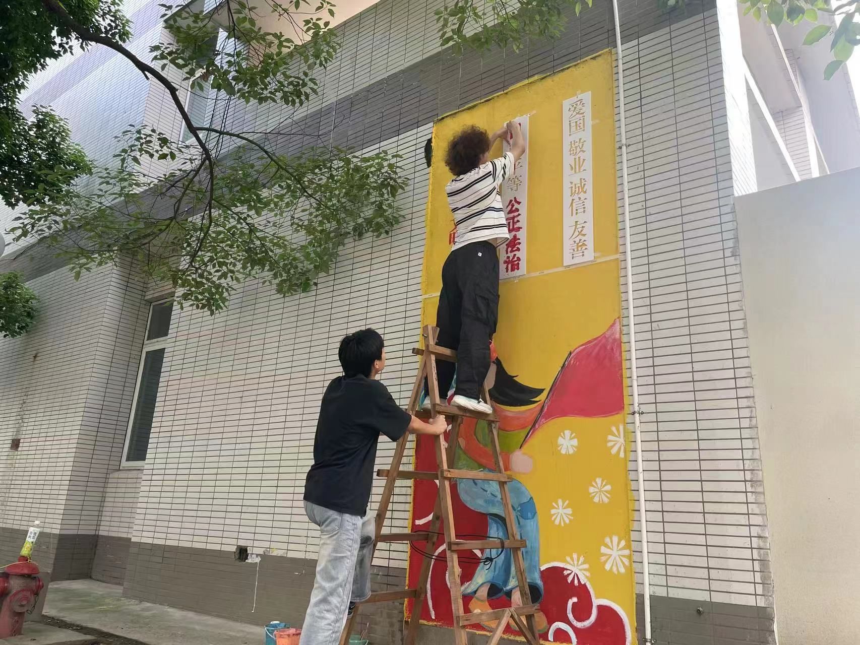 6月14日下午,艺术设计学院于大生社区女生宿舍开展“斑斓生活,绘艺阳光”学生社区墙绘活动,辅导员张馨玉及10余名学生代表参加此次活动。本次活动由学工处一站式社区服务中心与艺术设计学院自管会共同策划,旨在通过墙绘这一艺术形式,让艺术走进生活,让创意点亮社区。