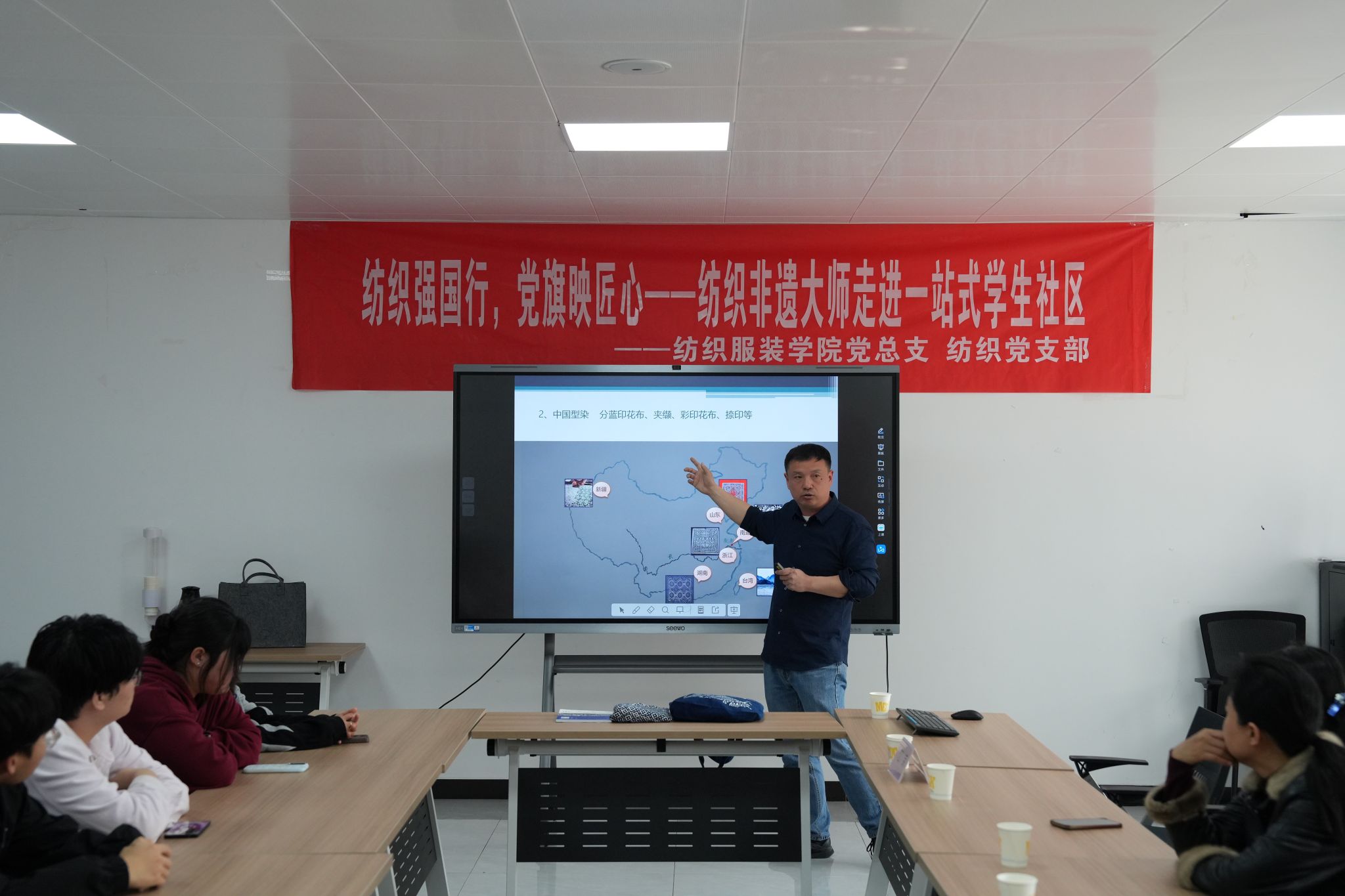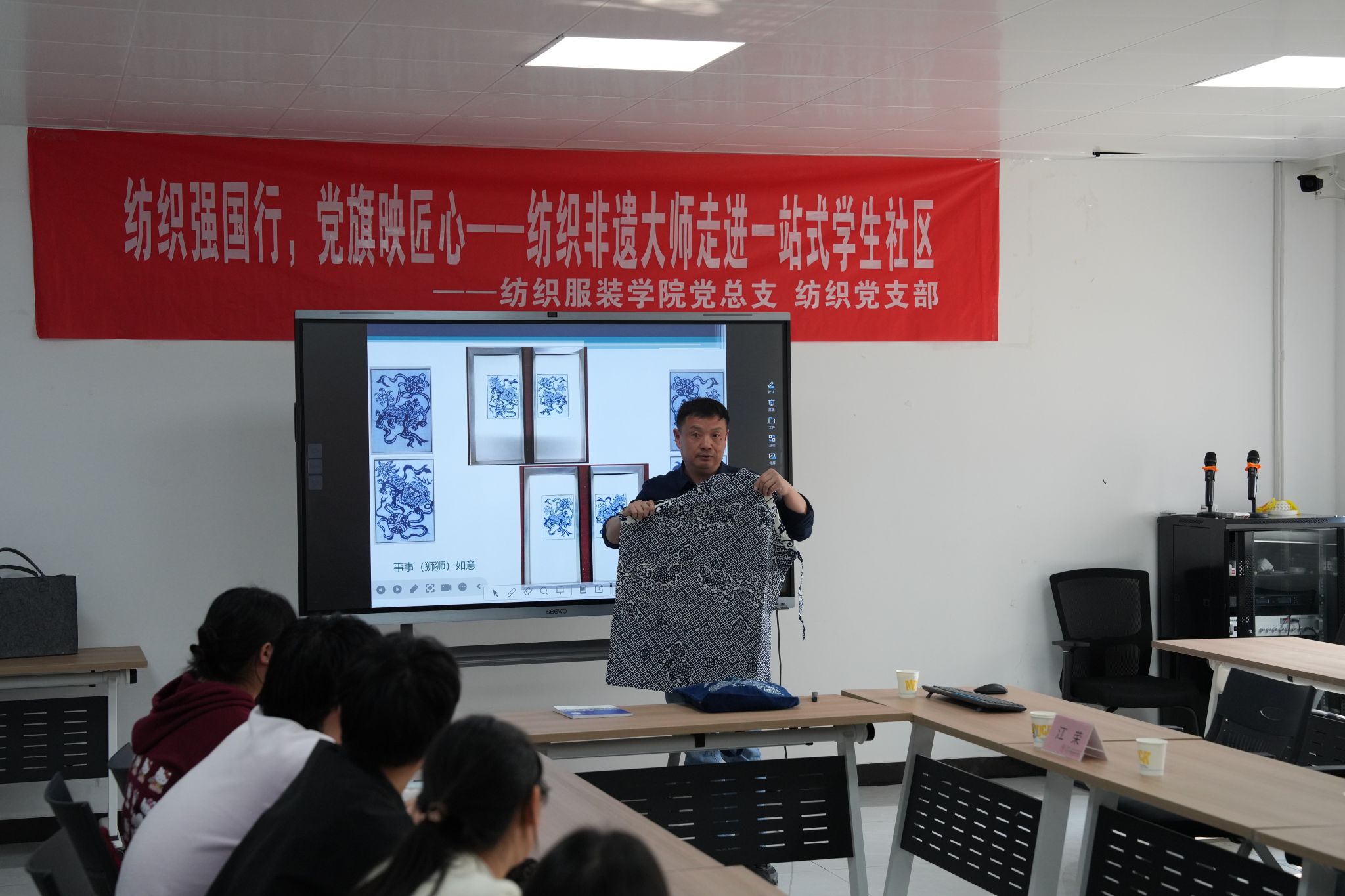 4月2日下午,全国高校“双带头人”教师党支部书记“强国行”专项行动团队走进我校“一站式”学生社区开展非遗文化进社区活动。南通蓝印花布非遗传承人江荣教授、纺织服装学院党总支书记夏爱萍、纺织党支部书记隋全侠、学院关工委教师代表瞿建新、教育部“强国行”专项行动团队成员及30余名学生代表参加了本次活动。