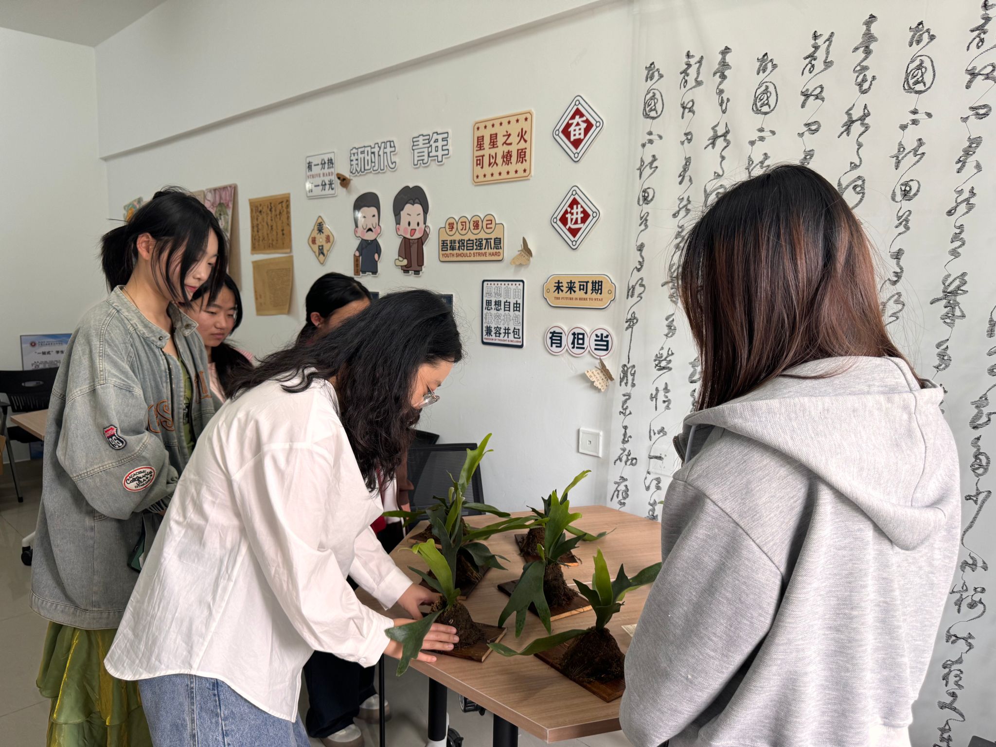 为积极响应学校要求,推进我校“一站式”学生社区建设提质增效,艺术设计学院开展“一站式”学生社区风采展示活动。4月16日下午,艺术设计学院在大生社区内4快乐加油站开展一场别开生面的绿植上墙实践活动。环境空间设计团队专业教师宁尚尚、辅导员张馨玉带领励志社10余名学生,携手三名家庭经济困难学生共同参与鹿角蕨种植与墙面装置创作,将专业教学融入社区美化,打造“会呼吸的宿舍生态空间”。
