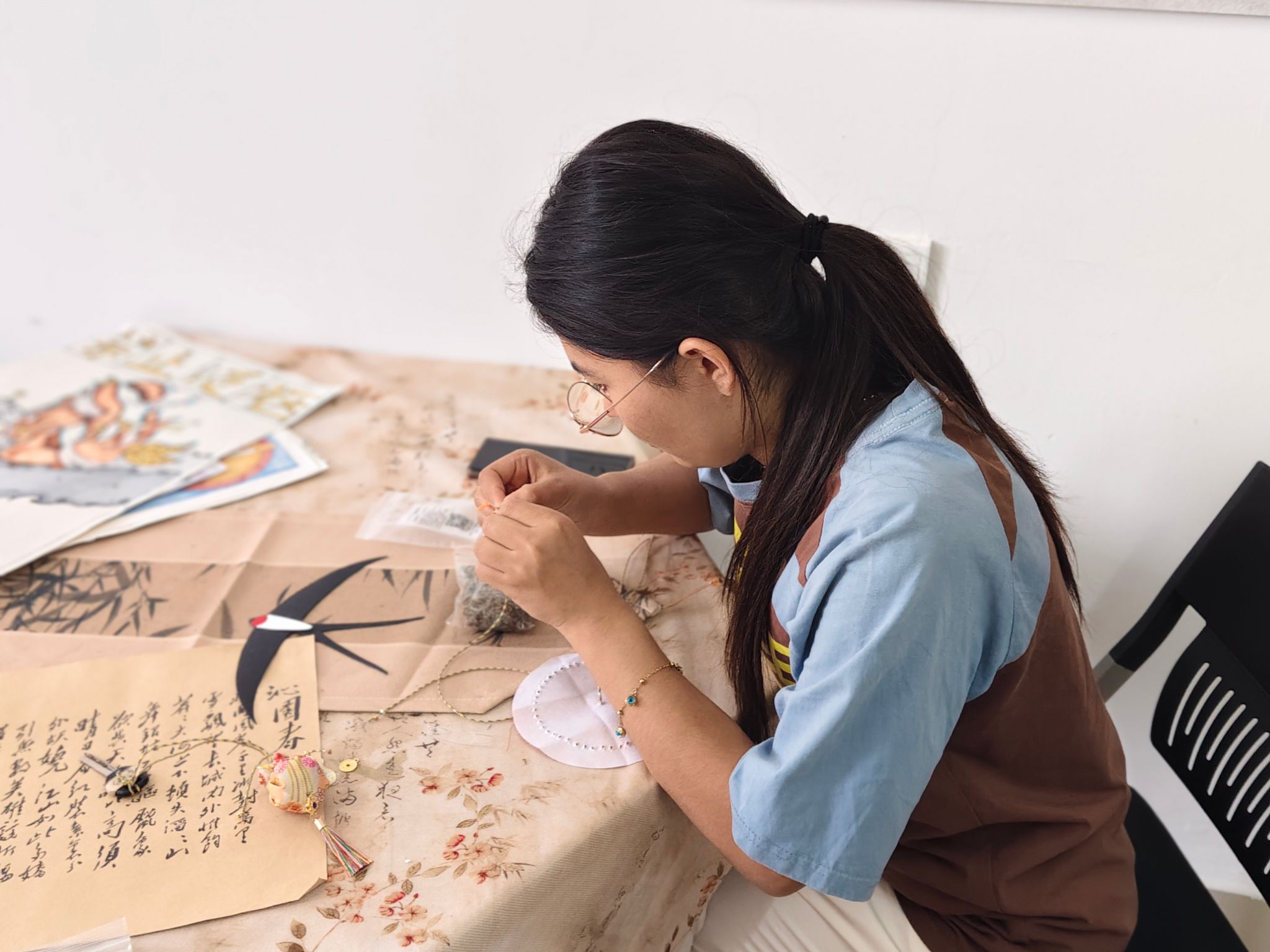 时值端午佳节来临之际,为弘扬中华优秀传统文化,增进各民族学生间的交流与情谊,艺术设计学院于2025年5月28日下午,在大生社区内4快乐加油站精心组织了“香约端午,绣美同心”民族风香囊创作工坊活动。来自不同民族的十余名同学以及部分家庭经济困难学生积极参与,共同沉浸在传统手工艺的独特魅力之中。