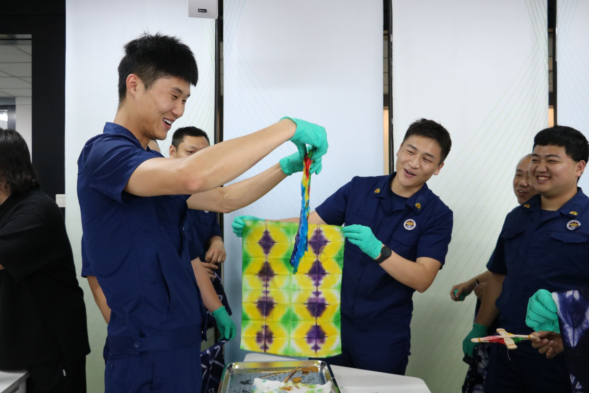 活动首站以“非遗扎染体验”拉开序幕。纺织服装学院专业教师季媛携手学田消防救援站队员,在扎染工坊展开了一场文化与安全的对话。季媛手把手指导消防队员体验扎染技艺。消防队员结合扎染工艺中的“火候控制”“燃料存放”等细节,现场讲解纺织类实验室及手工作坊的消防隐患排查要点。这种跨界互动不仅让非遗文化“活”起来,更让消防安全意识在潜移默化中深入人心。