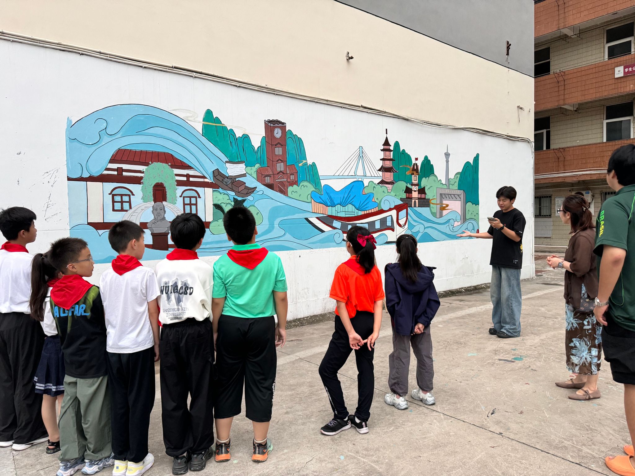 活动伊始,艺术设计学院志愿者带领江海少年宣讲团成员,共同参观一站式学生社区内的墙绘作品《一个人,一座城》。该作品由艺术学院23视传一班刘祺同学创意设计,以张謇先生生平为主线,通过流畅的笔触和多维的视角,生动再现了南通的历史变迁与文化脉络。画作长7.5米、高2.5米,融合大生纺织纱厂、支云塔等历史地标与南通大剧院、江苏工程职业技术学院等现代建筑于一体,并以海浪、帆船等元素串联,形成一幅跨越时空的南通画卷。志愿者现场讲解了作品的创作理念与文化内涵,展现了学院学子对南通深厚历史的理解与艺术的表现力。