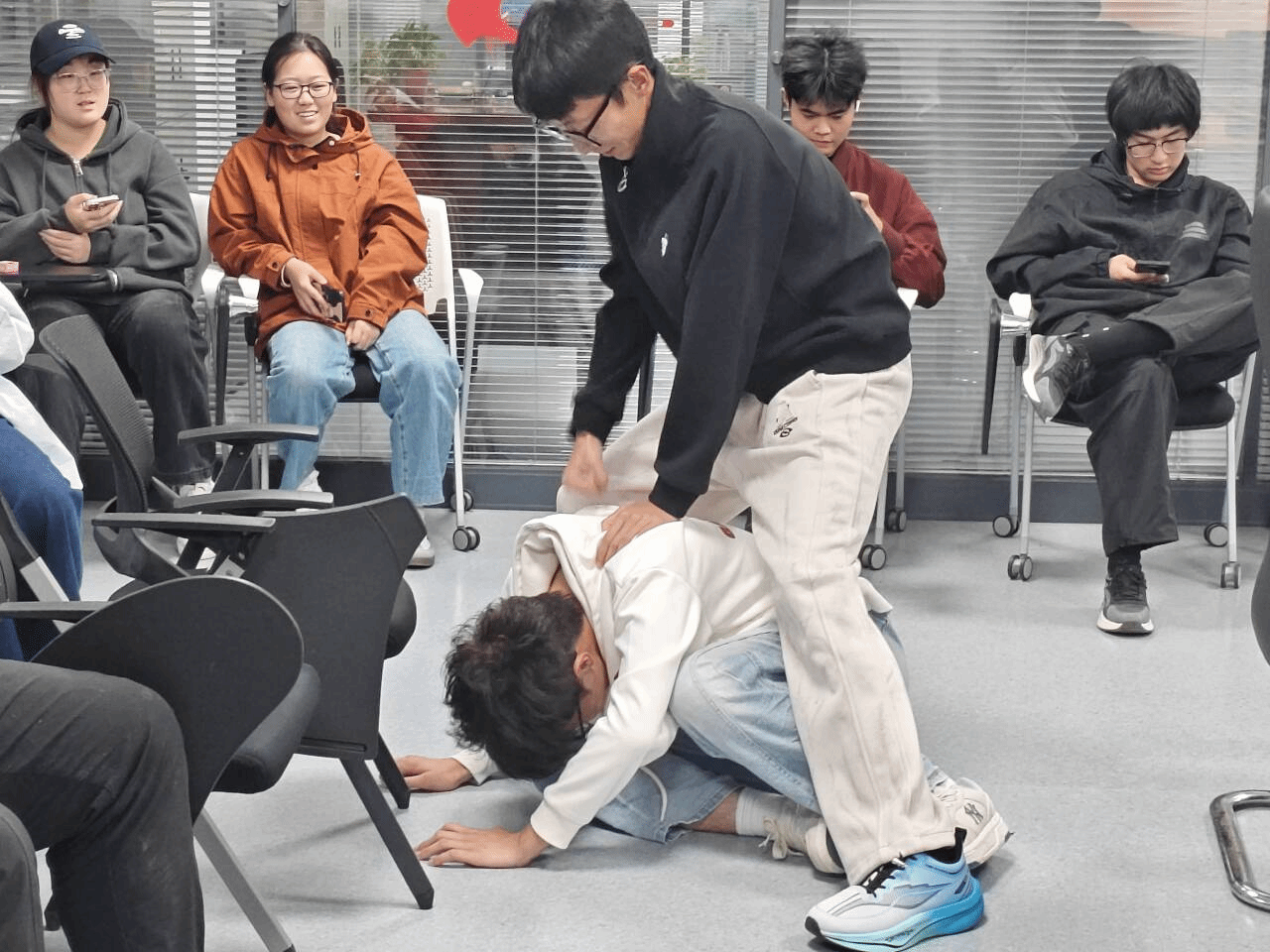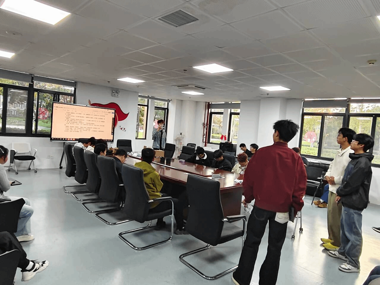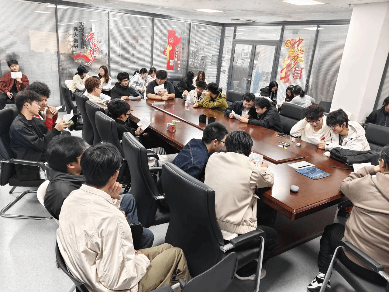 知识问答环节,社长严欣悦抛出四大名著中经典情节、人物关联等问题,同学们踊跃举手抢答,现场氛围迅速升温;随后进入剧本讨论环节,大家围绕改编自名著片段的剧本,梳理角色逻辑、打磨台词细节,在交流中深化对故事的理解;最生动的是剧本杀演绎环节,同学们化身经典角色,现场还原“武松打虎”等情节——扮演武松的同学以鲜活的肢体动作,将景阳冈上的紧张对峙展现得淋漓尽致,让“书中故事”变成了沉浸式的现场戏剧。