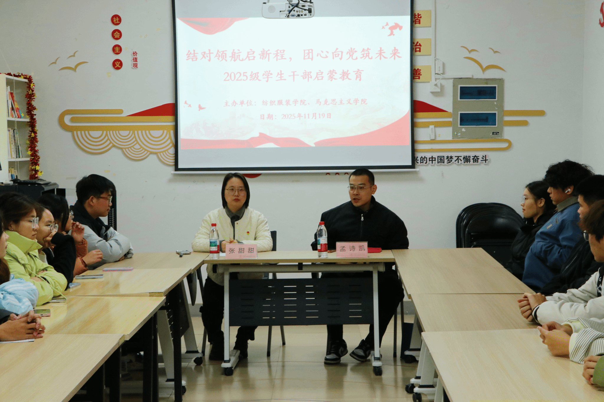 11月19日中午,纺织服装学院联合马克思主义学院在一站式学生社区活动室举办了学生干部启蒙教育学习会,马克思主义学院专业教师张甜甜,纺织服装学院团总支副书记孟诗凯,院自管会、学生会全体学生干部参加了本次活动。